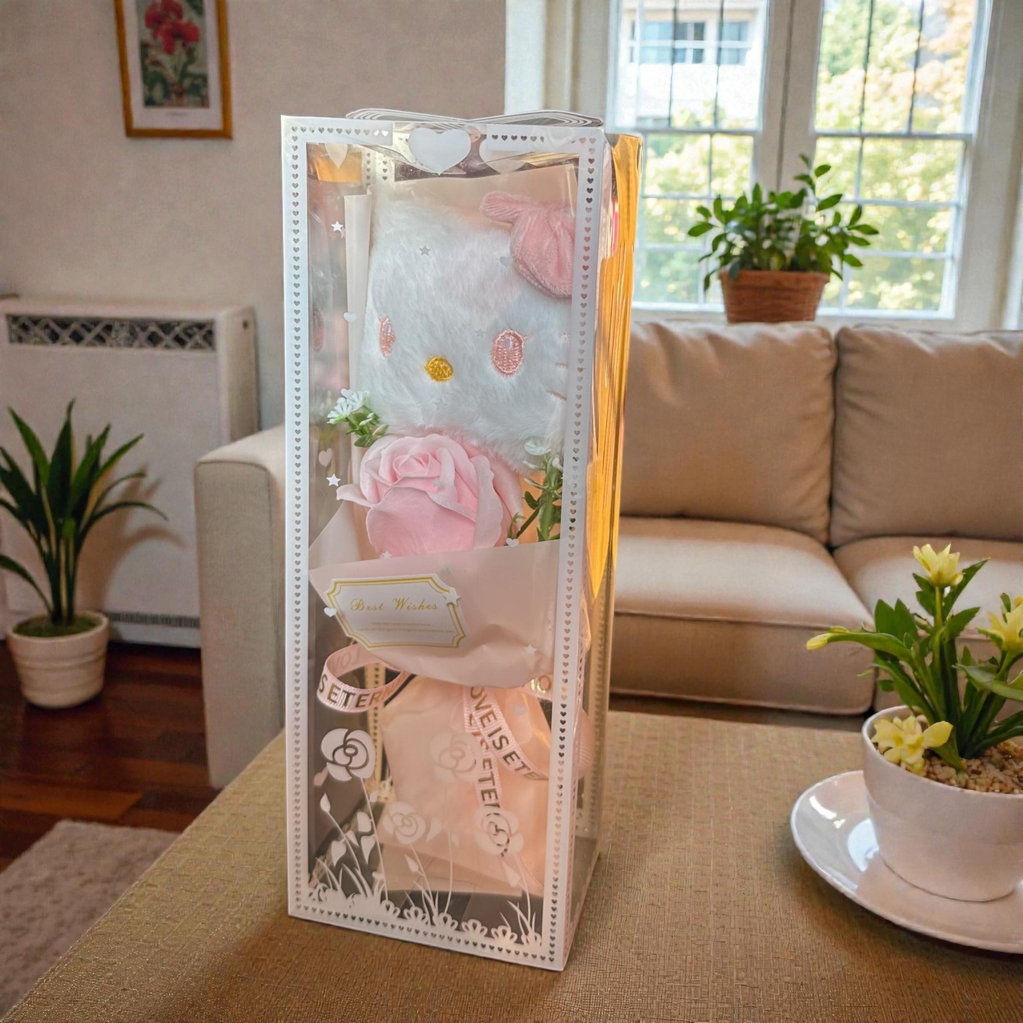 Ramo de una Rosa y Kitty de Peluche en Caja de Regalo